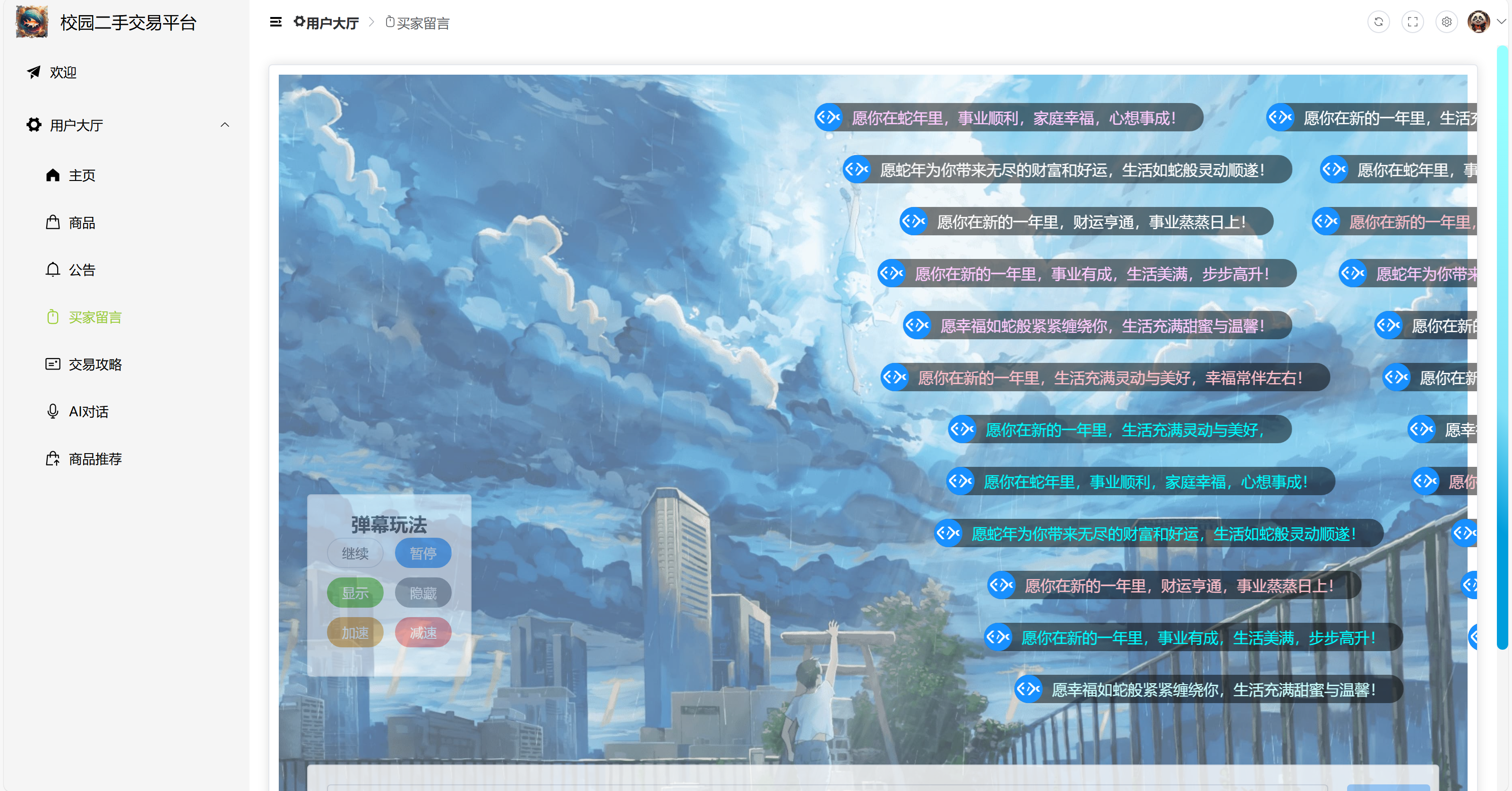 4)买家留言:支持弹幕留言功能,用户可以进行添加,并使用弹幕玩法(继续、暂停、显示、隐藏、加速、减速)。
