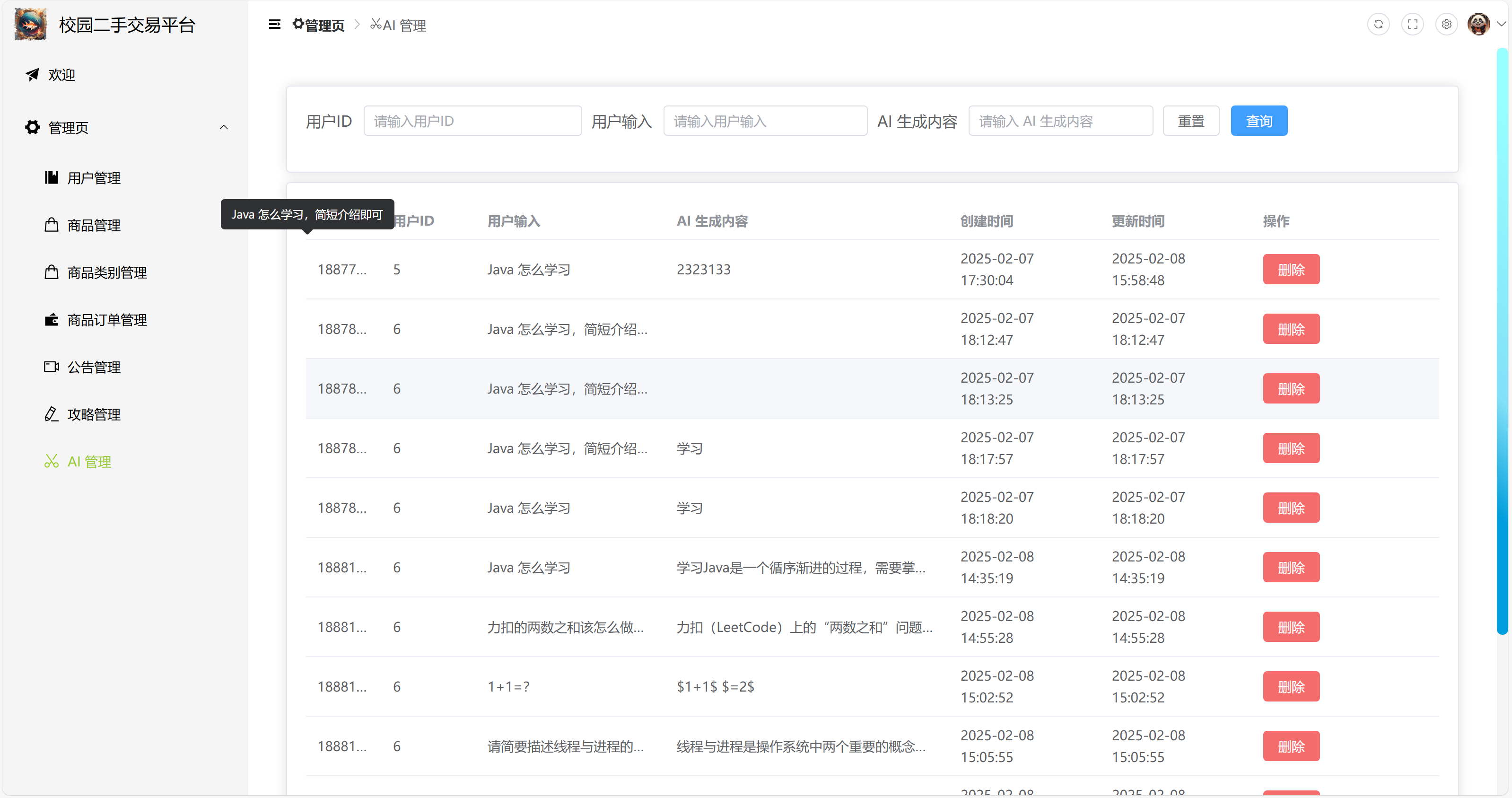 4)AI 对话管理:删除用户与 AI 的对话记录,支持分页和模糊查询(用户 ID、用户输入、AI 生成内容)。