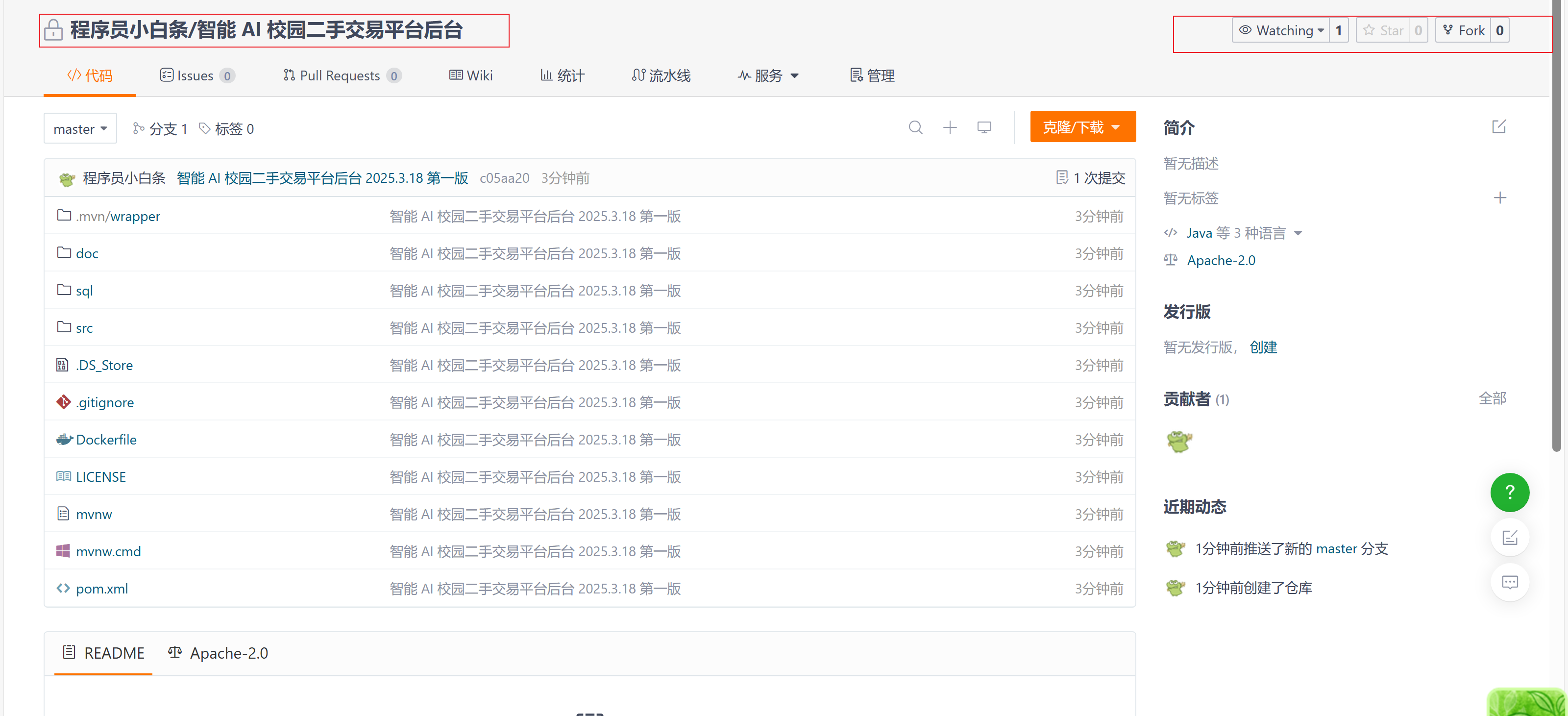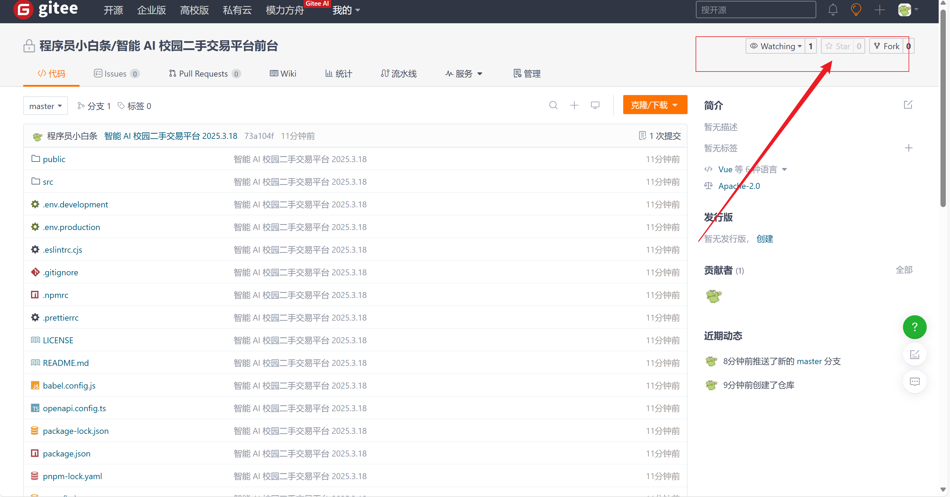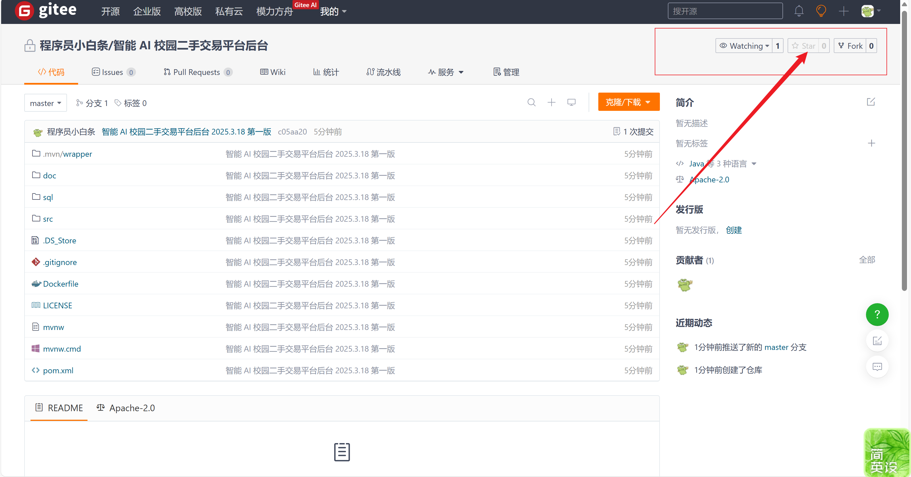 1)点击克隆/下载项目,会使用 Git 进行版本控制的,推荐 Git Clone,不会的小伙伴可以选择下载一个 Zip 压缩包,然后解压到自己电脑的 D 盘,建议收藏项目,后续方便获取相关版本更新信息,也可以 Fork 到自己的本地仓库,拷贝副本。