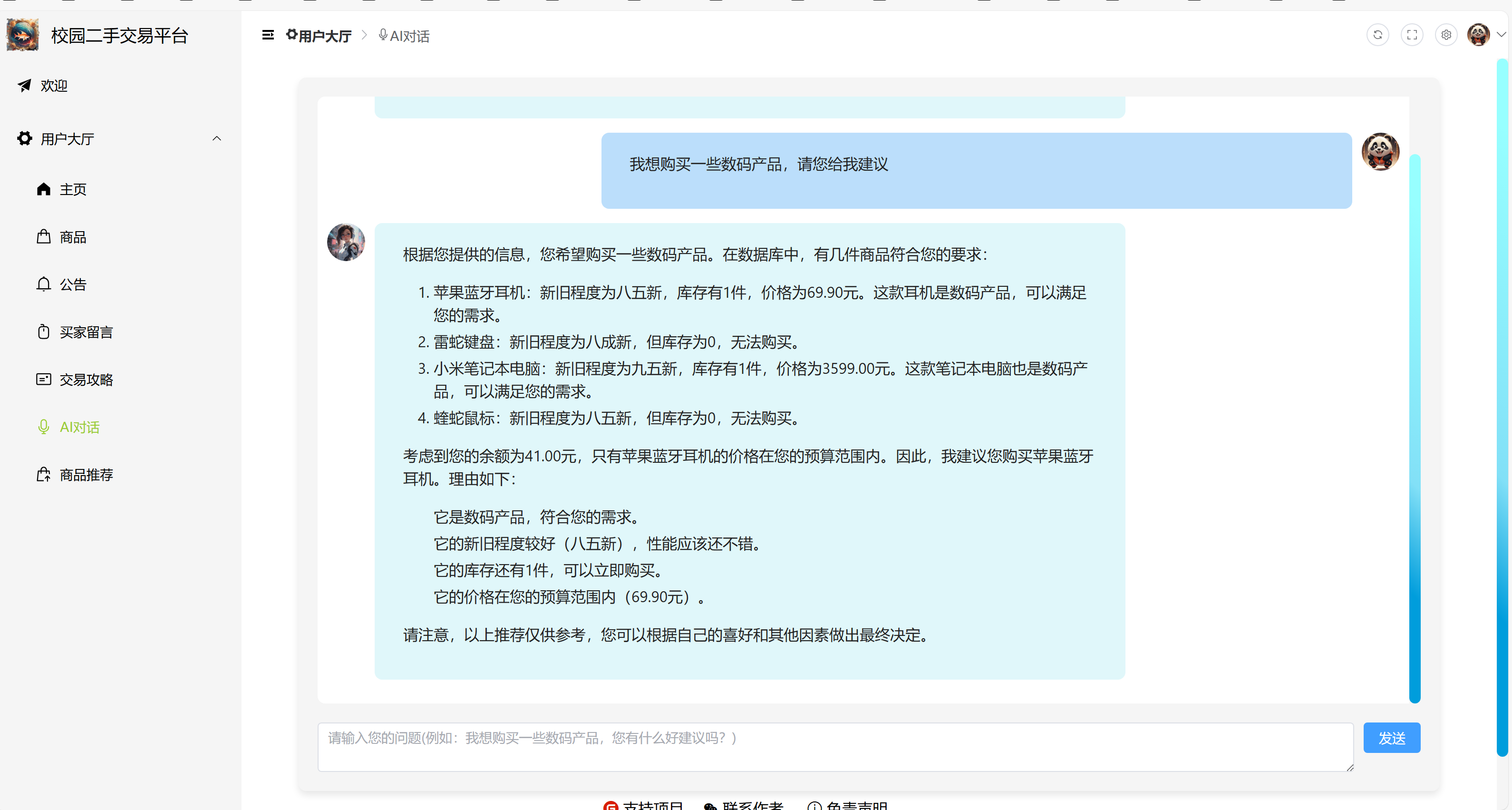 6)AI 对话:用户可以与 AI 购物顾问进行聊天,AI 会根据用户的偏好推荐二手商品,并采用协同过滤推荐算法提升推荐精准度。AI 会在数据库层面查询商品和价格以及新旧程度,然后根据用户现有的余额进行适配性推荐。