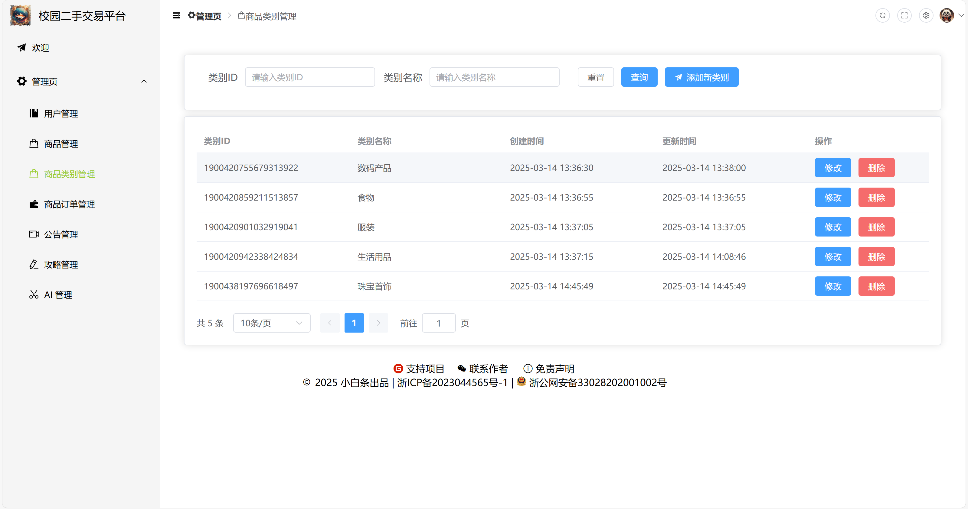 6)商品类别管理:添加新类别、修改类别、删除类别,支持分页和模糊查询(类别 ID、类别名称)。