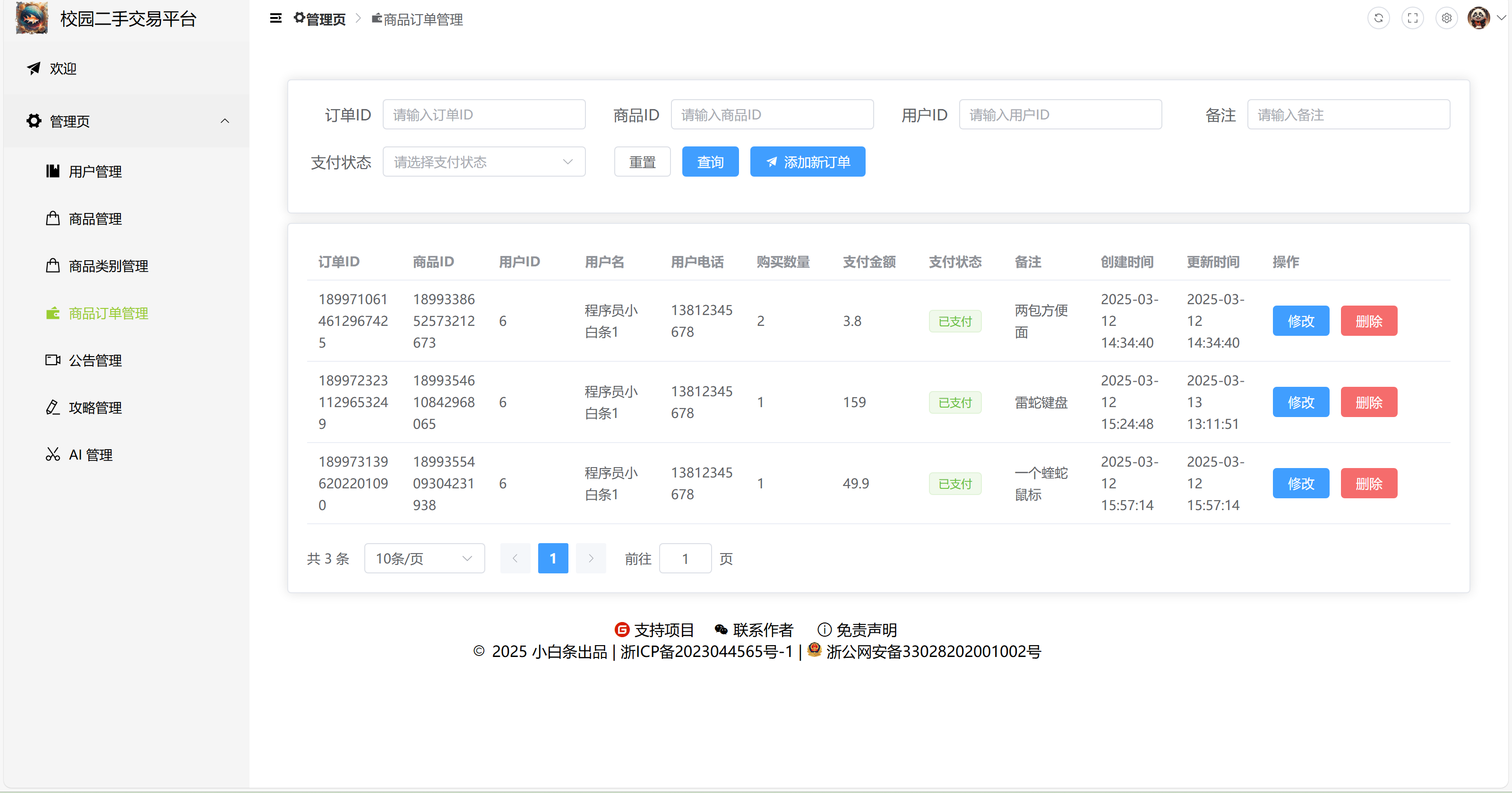 7)商品订单管理:查看、修改、删除用户订单,支持分页和模糊查询(订单 ID、用户 ID、订单状态)。