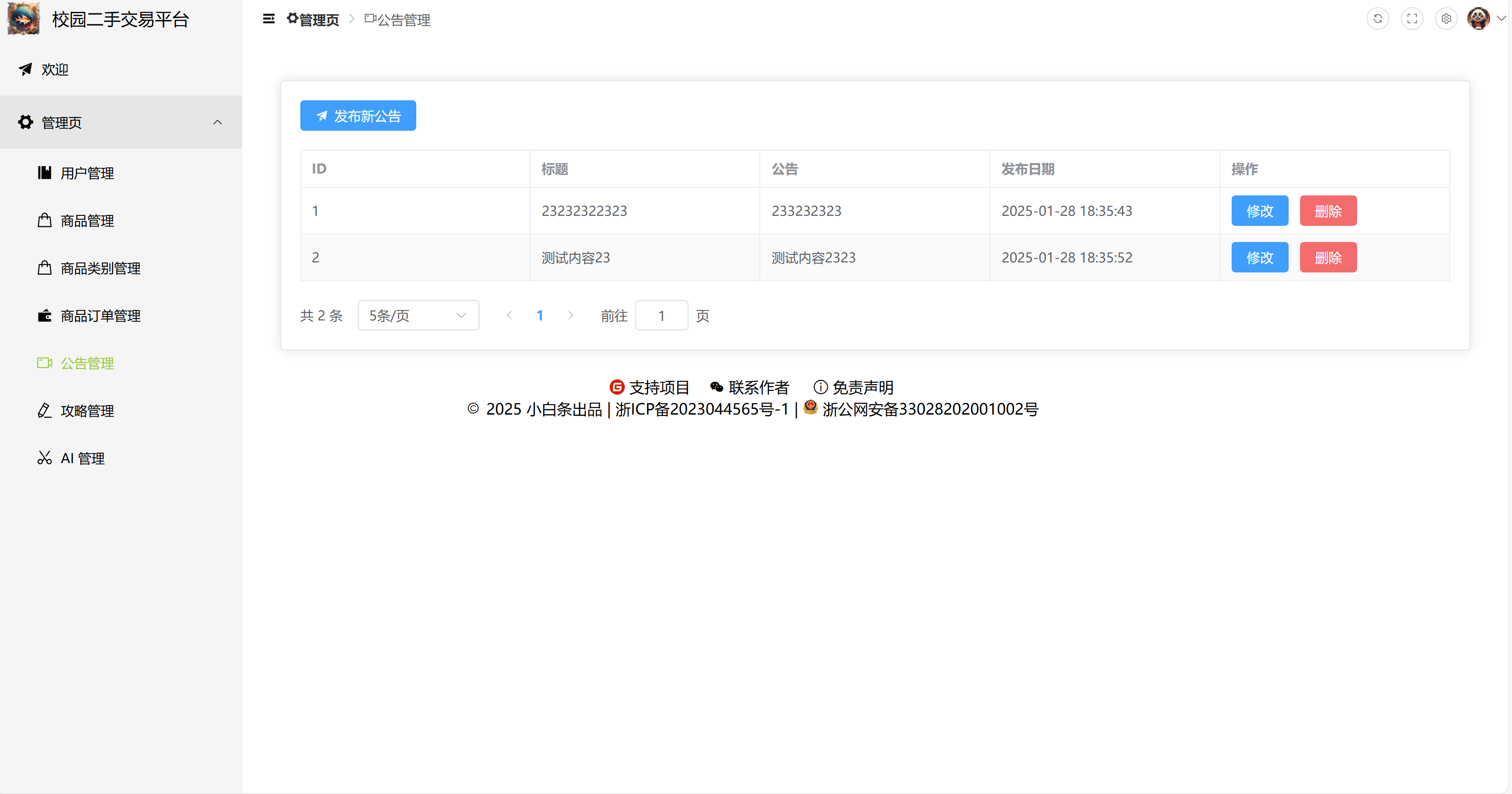 2)公告管理:发布新公告、修改公告、删除公告,支持分页。
