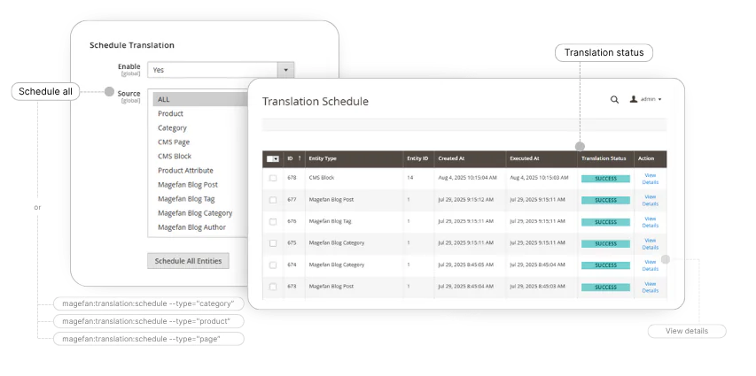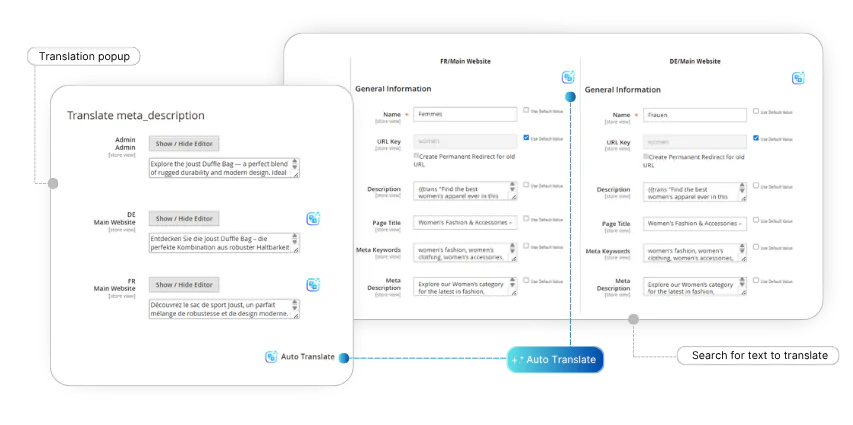 Automatically translate product and category attributes, CMS blocks and pages, Magefan Blog posts, and more, individually or in bulk.