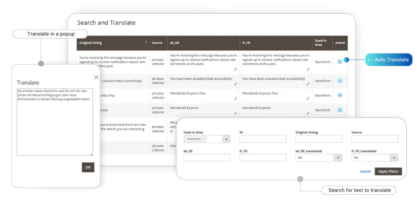 The Magento 2 Translation Extension makes the process easier. Each translation you make is carefully stored in the Translations panel. You can quickly find the required text by using original/translated text, locale, or store views filters.