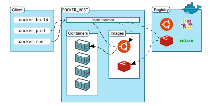 Docker uses a client-server architecture. The Docker client talks to the Docker daemon, which does the heavy lifting of building, running, and distributing your Docker containers. The Docker client and daemon can run on the same system, or you can connect a Docker client to a remote Docker daemon. The Docker client and daemon communicate using a REST API, over UNIX sockets or a network interface.
