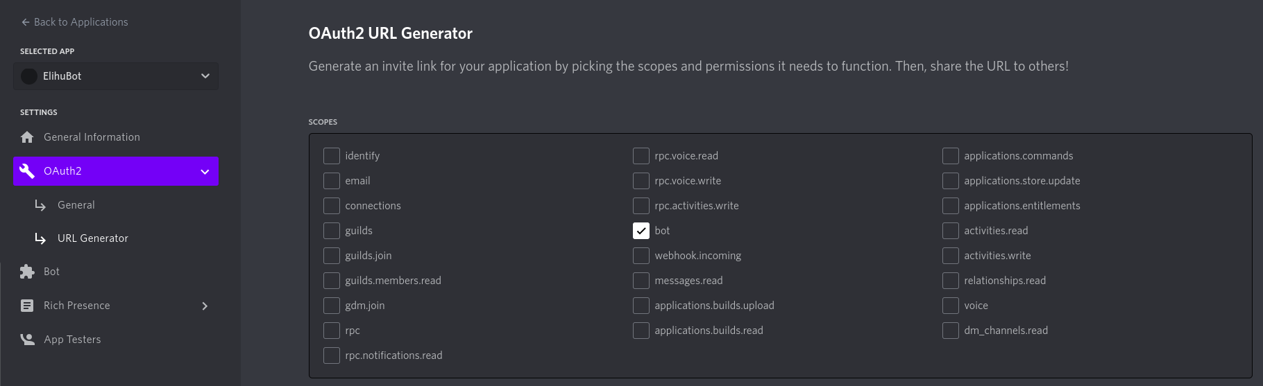 botin the scopes section. - Select the permissions you want to give to the bot. Here we have selected