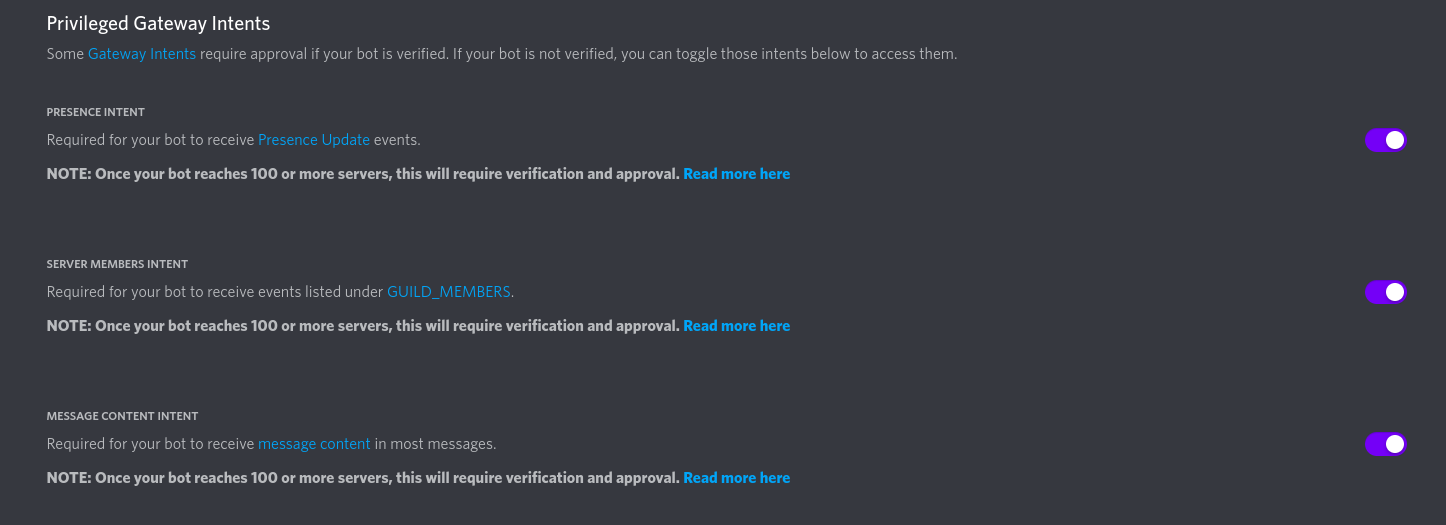 - Go to the bot tab and create a new bot. Also select all the privileged gateway intents for the bot.