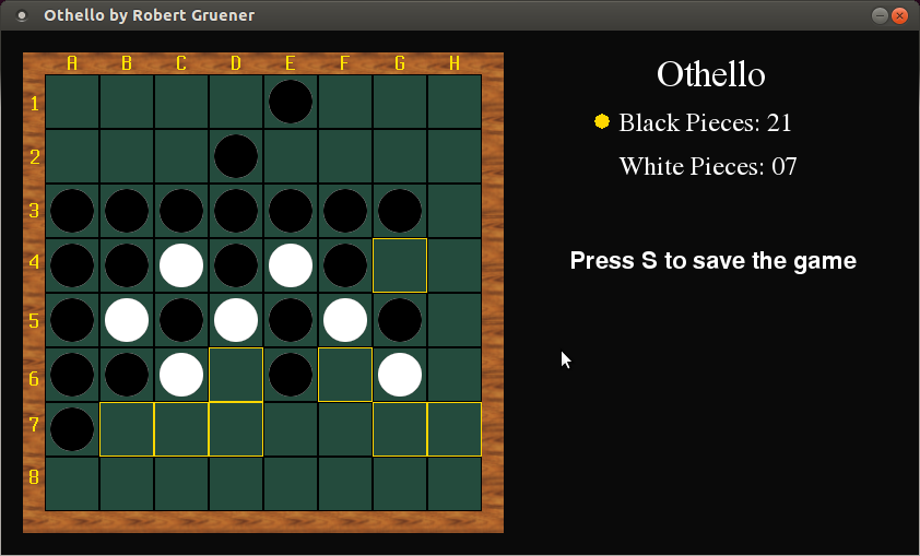 Once running, use the arrow keys to select game options, including which players are human/computer and how long to give the AI players to "think" about their moves. To make moves, simply click in the desired highlighted square.