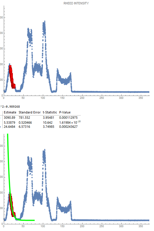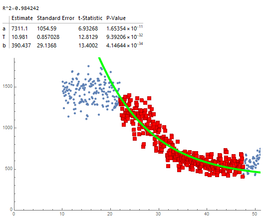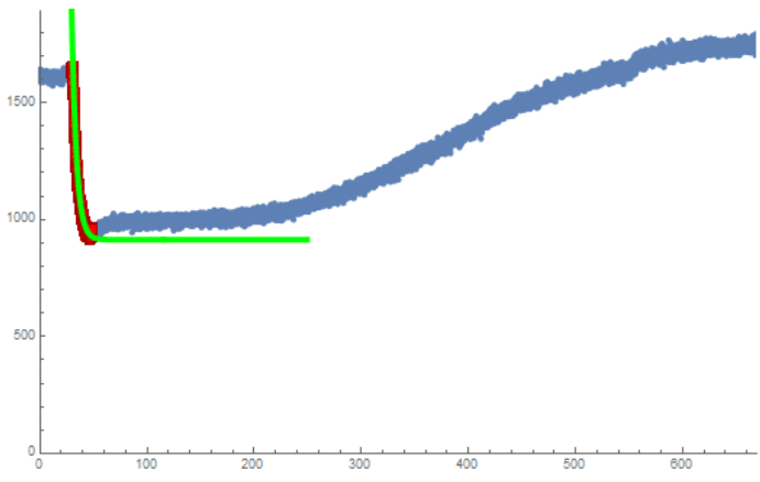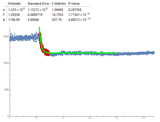 Finally, the code then takes the region between the marked start and endpoints and fits it to the model mentioned above, with seed values of 100000 for a, 5 for T, and 500 for b.