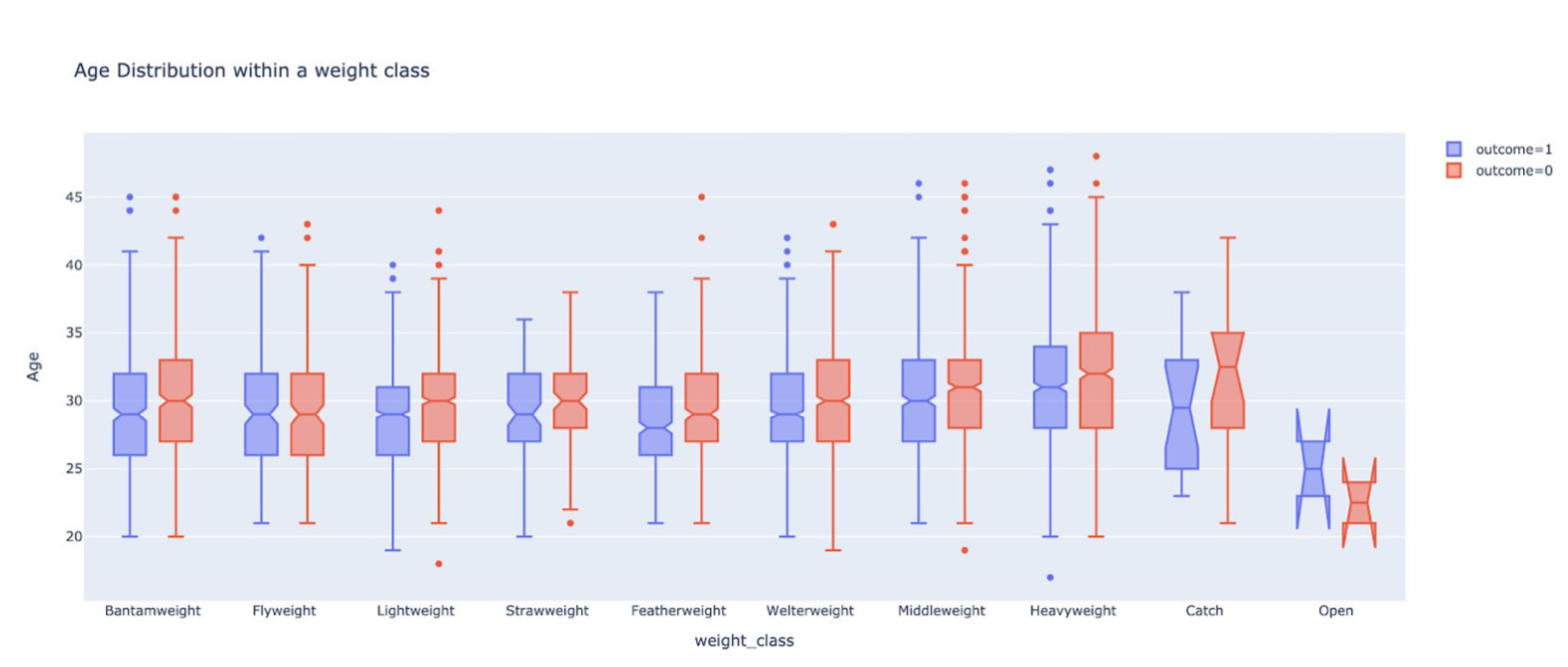 Conceptually this made sense as the more weight behind a punch the harder the hit.Examining physical attribute differences showed that older fighters were less likely to win a fight, with no observable difference in height within a weight class between xwinners and losers.