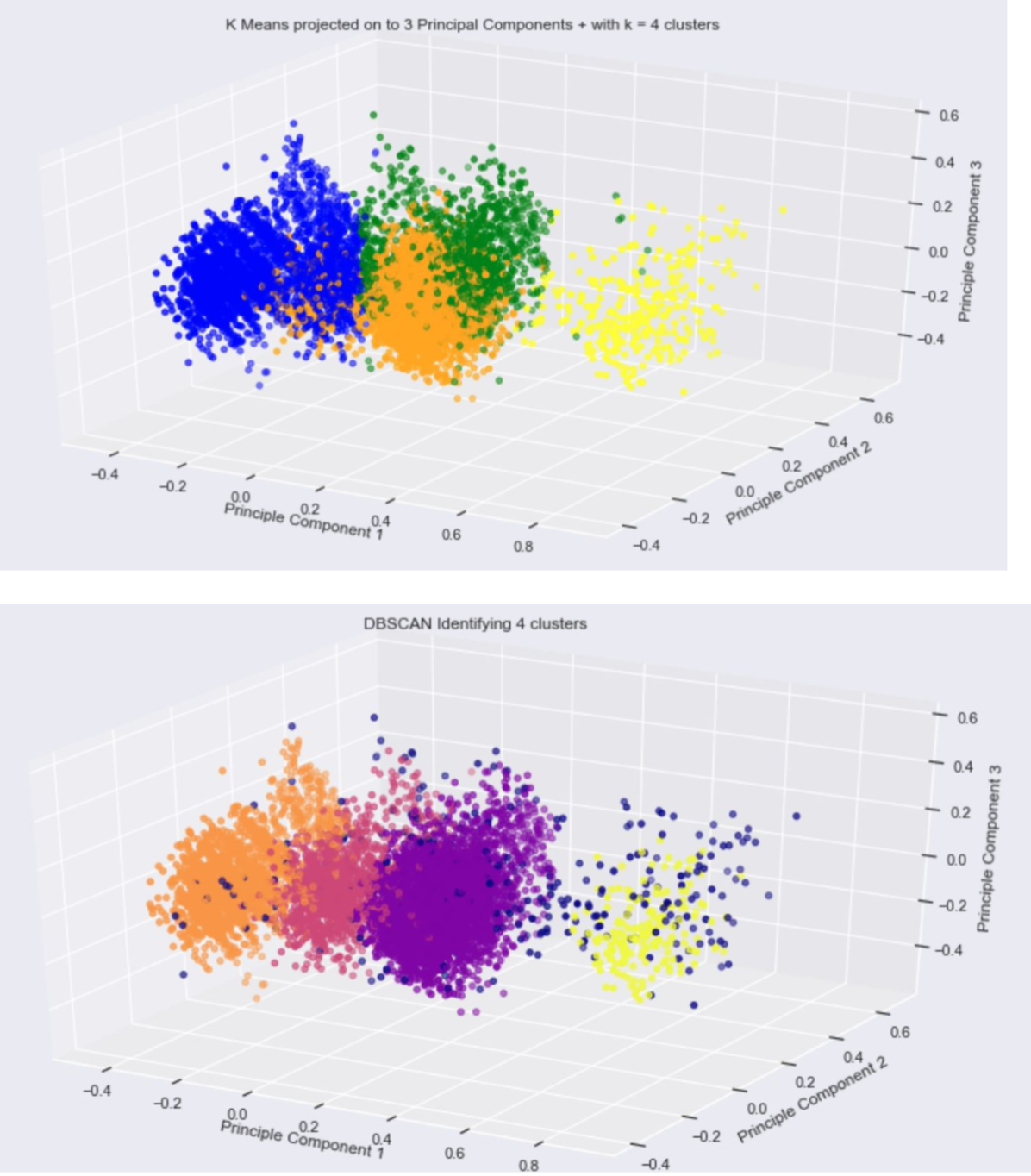 Infight statistics were highly correlated with one another showing the first hint of skills, i.e a fighter that threw a large number of punches to the head also through a large number of punches to the body, indicating he/she was a skilled striker. Clustering algorithms were applied to low correlation features and evaluated over the 3 main principle components.