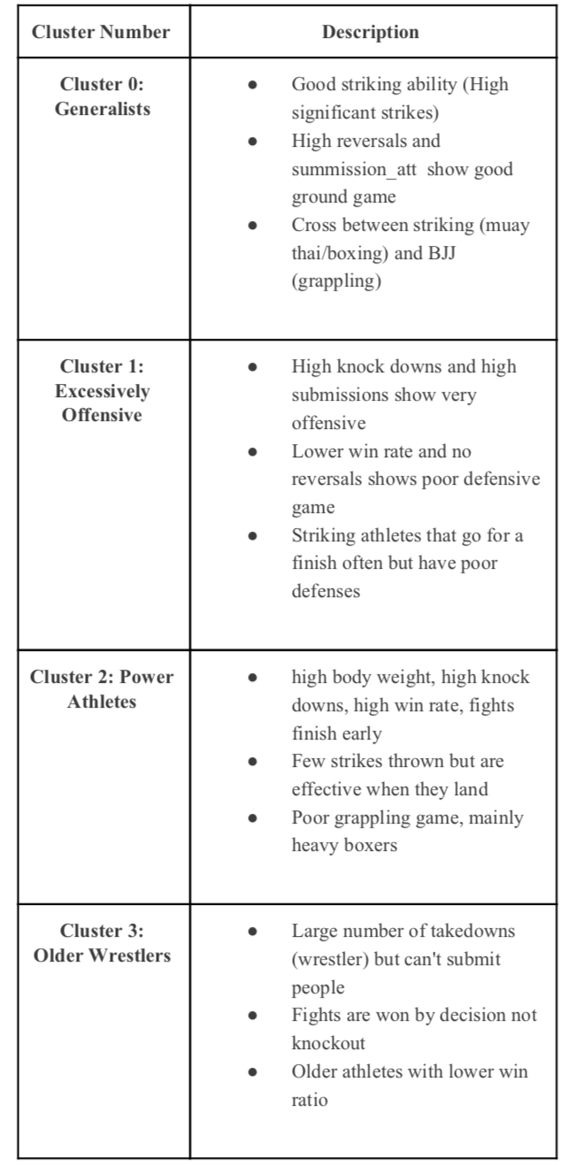 Interestingly the points that DBSCAN was not able to classify were also added to the parallel coordinates with the next two highest win averages but outperformed them by 15%, as well as showing significantly better infight variables. Although thisbehaviour seems bizarre DBSCAN is noted in literature for it anomaly detection ability[6]. When evaluating fighters in this smaller cluster it appeared to contain the majority of the UFC champions.