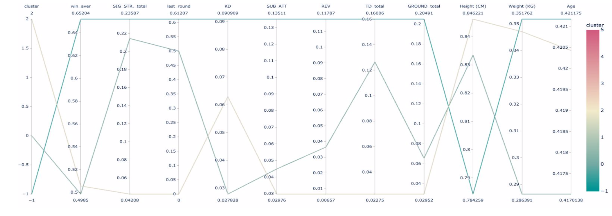 K-means was unable to resolve clusters effectively whilst DBSCAN showed better resolutions with a small number of unclassified points, the averages of each cluster from DBSCAN were plotted on a parallel coordinates map, figure 5 and 4 distinct fighting styles defined in Figure 6.
