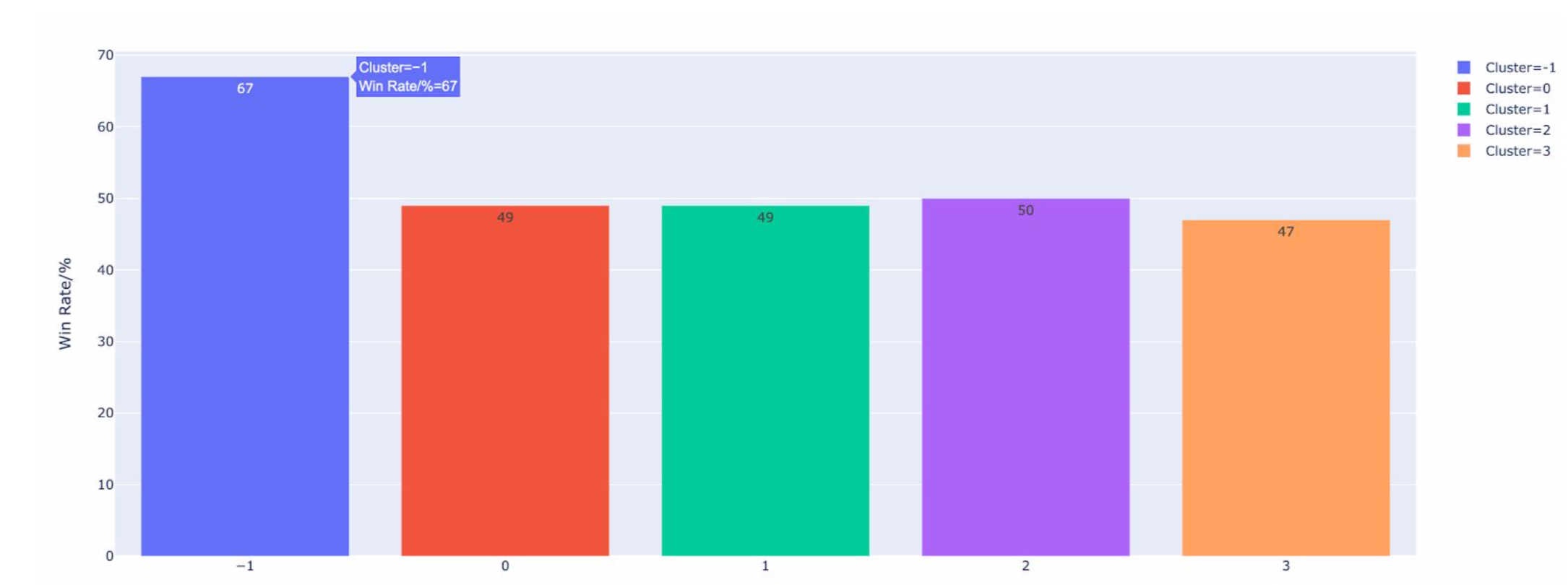Finally plotting the win rate of all the clusters (and the noise) to answer question 1 showed no significant difference in styles win rate with the exception of the outliers cluster, which had a significantly higher performance and was thus defined as a ‘Champion’ Cluster.