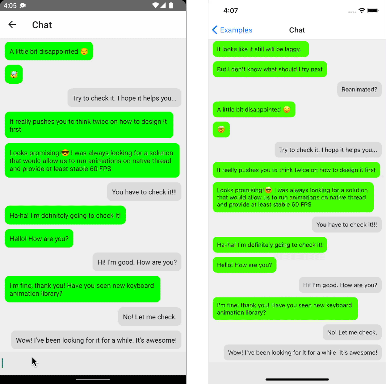 npm install react-native-keyboard-controller --saveCheck out our dedicated documentation page for info about this library, API reference and more: https://kirillzyusko.github.io/react-native-keyboard-controller/