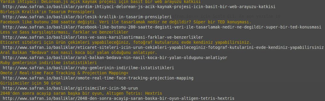safran safran.io için Scala CLI. En son yazılan 10 yazının başlığını ve linkini gösterir. run ./safran compile & execute scalac Safran.scala scala Safran