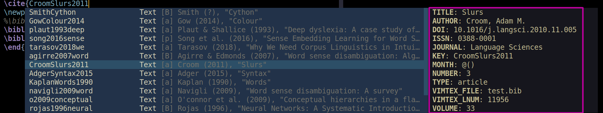 - Fuzzy matching against all info provided by Vimtex (including bibliographic details, useful for citations):