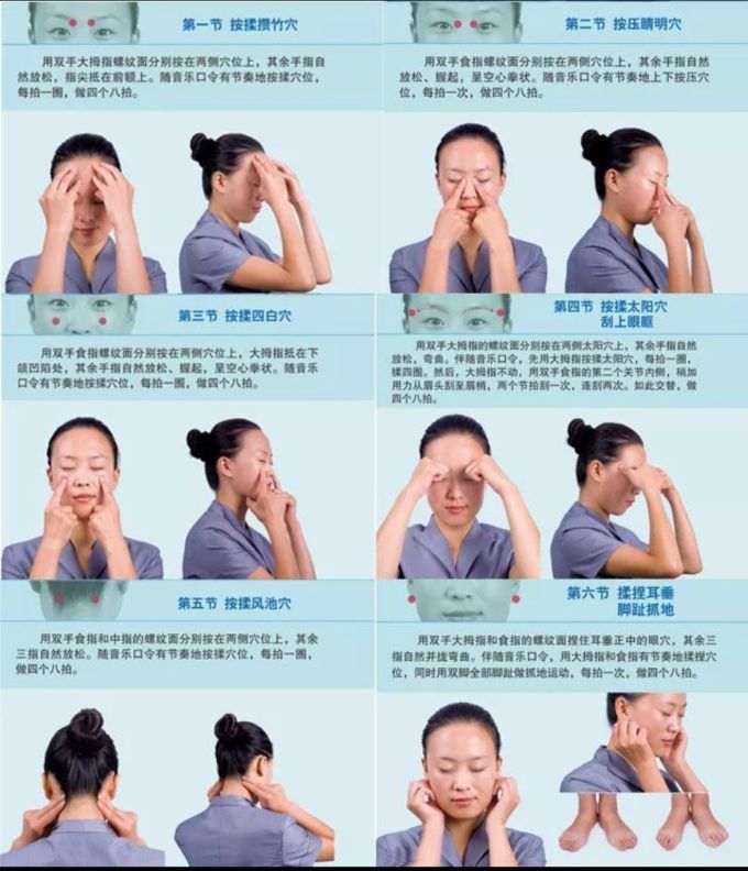 用双手大拇指螺纹面分别按在两侧穴位上,其余手指自然放松,指尖抵在前额上。随音乐口令有节奏地按揉穴位,每拍一圈,做四个八拍。