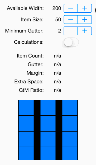 As the number of iOS screen sizes continues to increase, it becomes more and more difficult to design a regular grid of items that appears balanced at any size. JBSpacer calculates optimal spacing for a grid of items while maintaining a specified ratio between inner gutter and outer margin sizes.