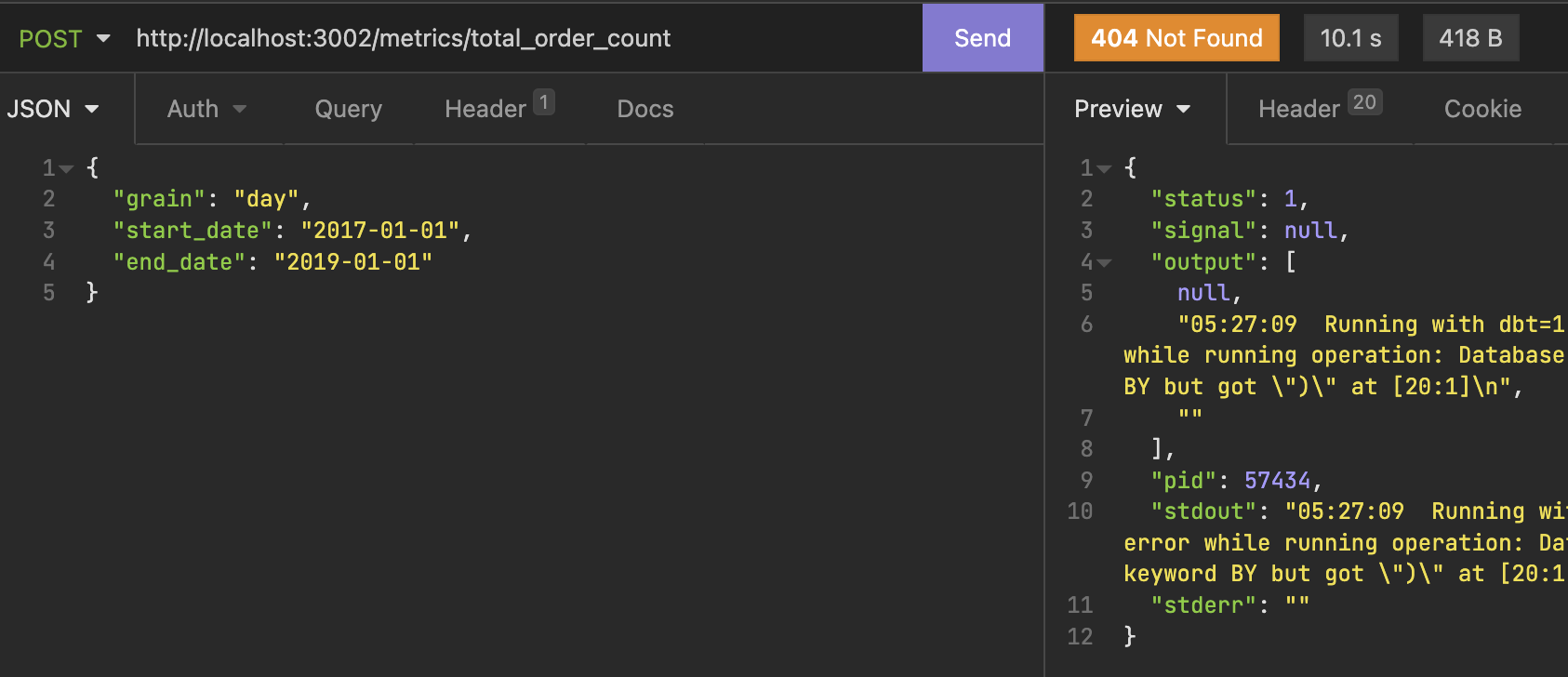 Hi team, just tried out `dbt-metrics-api` for metric layer usecase. Getting some error. <img width="843" alt="image" src="https://user-images.githubusercontent.com/60163707/163320315-ad969d8e-0a2e-44a4-977d-3984567aa9ca.png">