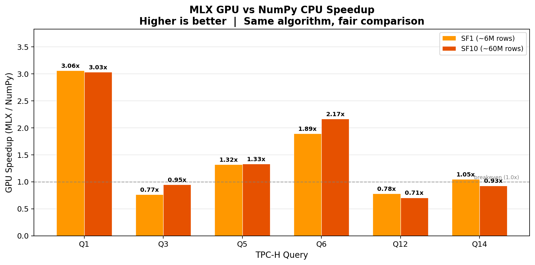 I wanted to share results from a research project benchmarking MLX on analytical database workloads - a use case outside the typical ML/deep learning focus.