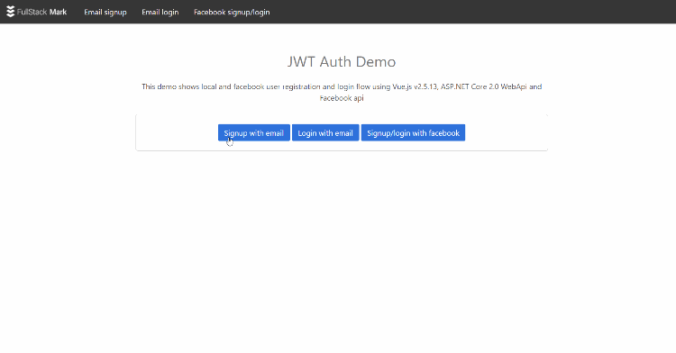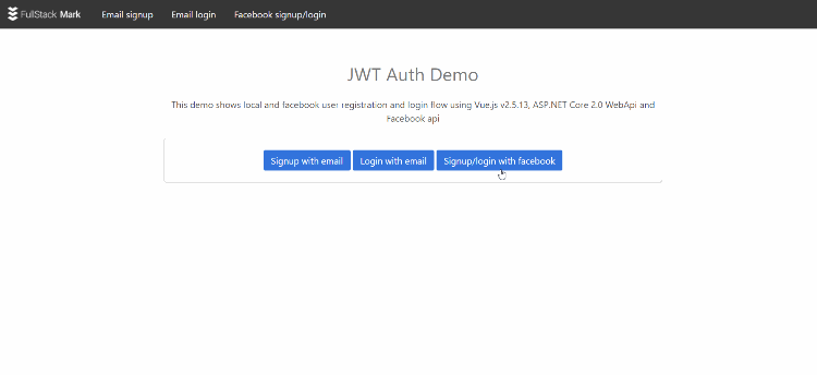 Sample project based on the blog post demonstrating jwt-based authentication with an Vue.js (v2.5.13) frontend and ASP.NET Core 2 WebApi. Includes both local user registration with .NET Core Identity membership and facebook login scenarios.