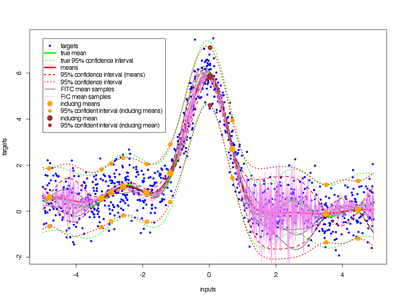 This OCaml-library, which also comes with an elaborate example application, implements some of the newest approximation algorithms (e.g. SPGP) for scalable Gaussian process regression for arbitrary covariance functions. Here is an example graph showing the fit of such a sparse Gaussian process to a nonlinear function: