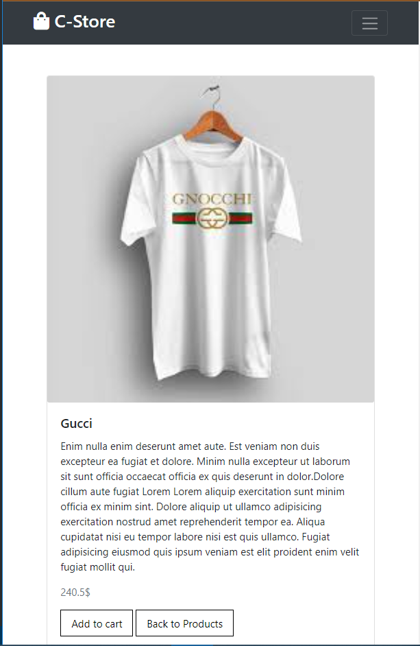 C-Store An ecommerce web application that helps you to buy clothes online easily. Built with reactJS, bootstrap, and firebase. Live website: c-store How it looks Web perspective Mobile perspective | | |