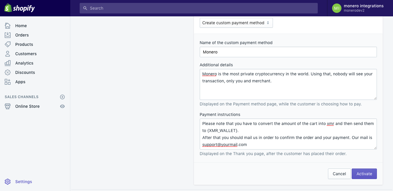 Monero Manual Custom Payment for Shopify Requirements: A Shopify shop A Monero wallet Work in progress Create a Monero wallet on your PC Copy your Monero wallet public address Under payments on Shopify, create a new custom payment gateway