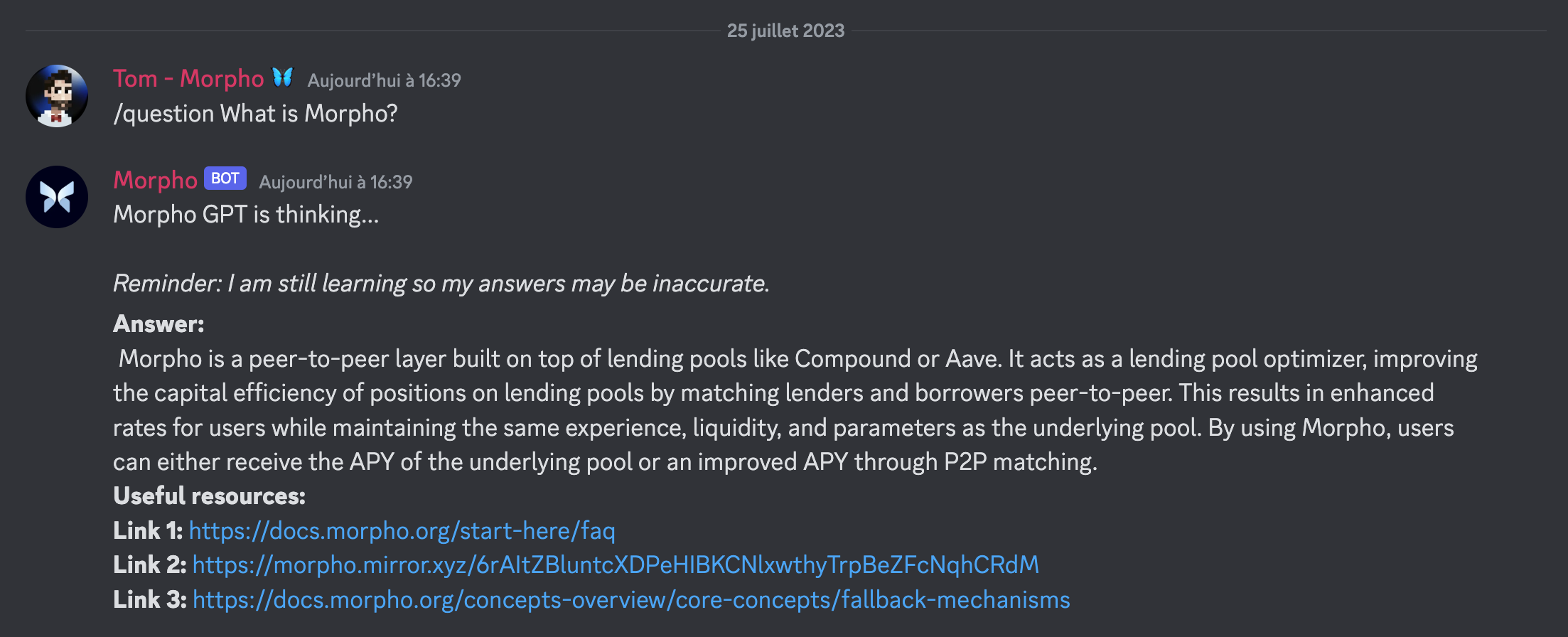 docker run -d -p 8080:8080 --env-file ./.env my-discord-botAll documentation to build the bot's knowledge base should be in .txt or .md files. The two first lines in each document must start with "Link" and "Title" for display purposes on Discord. This format allows the bot to include the source link and title in its responses.