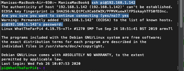 Let us first determine the Raspberry Pi's IP address by typing the following command in the terminal of your Raspberry Pi: