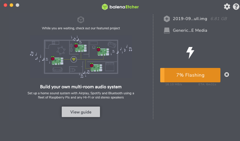 - Open balenaEtcher, select the image (or the downloaded Raspbian), select target (SD card) and click Flash.