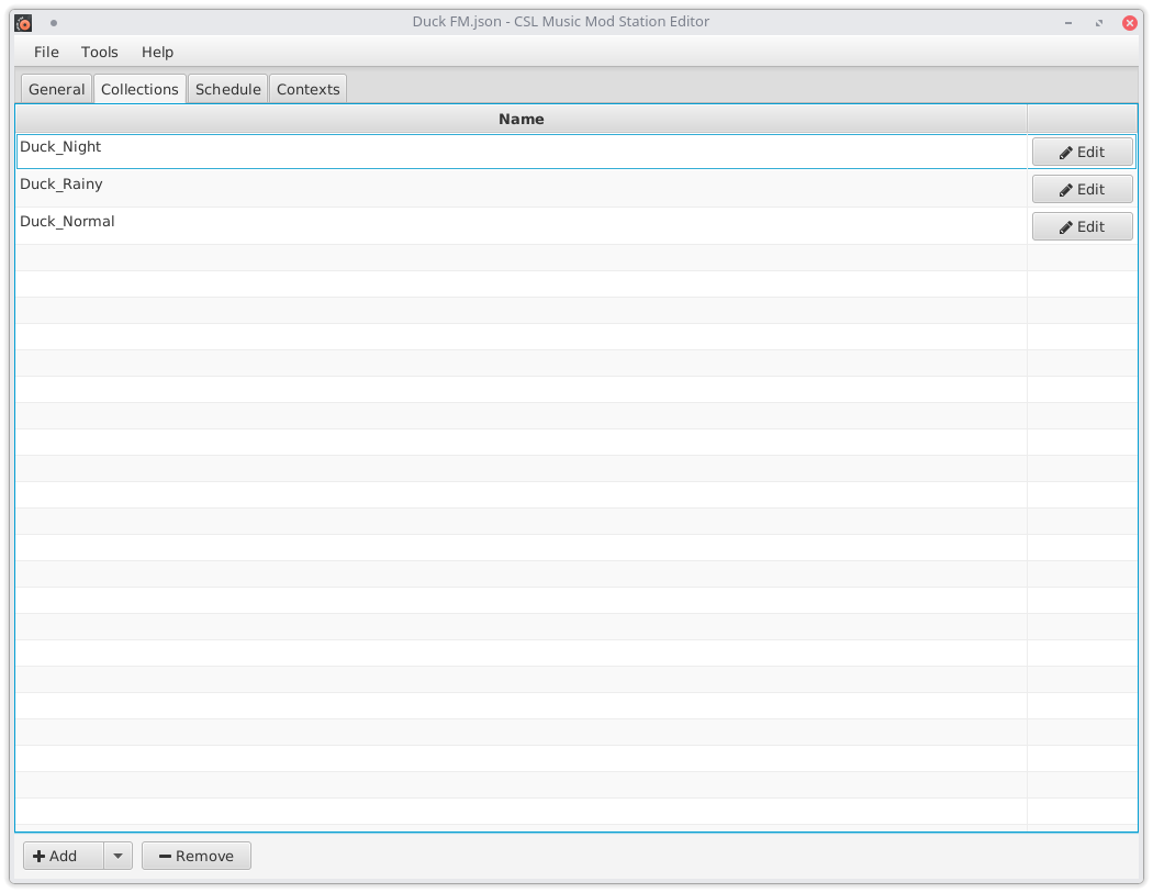 The next step will be to add the songs by editing the collections. But first you have to save the station. Pick some empty folder and save the station into it. You can add *.ogg songs by using the Add button or by dragging the files into the list. The editor will then copy the songs into the correct folder. You can also set the content type (music, talk, commercial, ...) within the editor that will rename the song file accordingly. All operations are just file operations. If you don't want to use the editor, you can just copy & rename the files using your file manager.