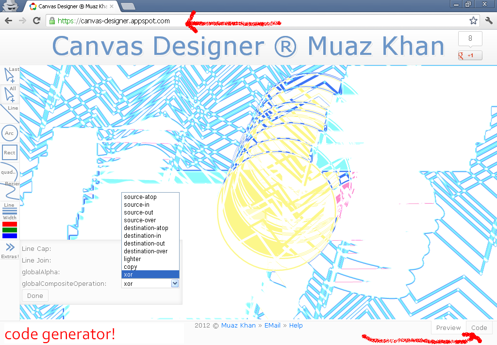 The specialty of this drawing-tool is that, it generates Canvas2D code for you; so simply draw and get the code! That code can be used in any javascript Canvas2D application.