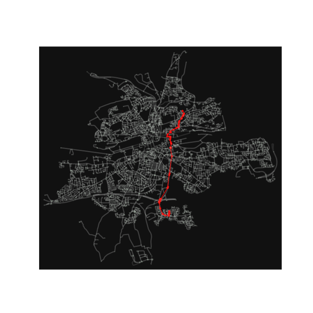 pip install tripsimHere we will simulate driving and plotting the points taken from one random point to another in a city.
