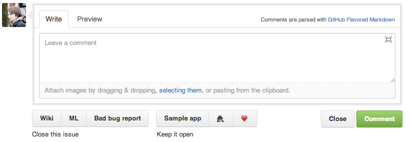 - Bad bug report button - close an issue with the following comment: You need to give us more information on how to reproduce this issue, otherwise there is nothing we can do. Please read CONTRIBUTING.md file for more information about creating bug reports. Thanks!