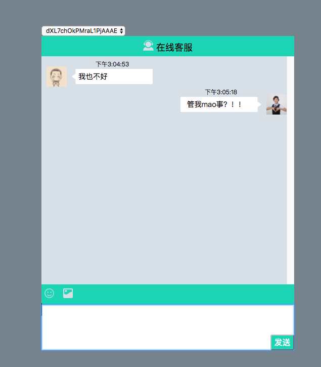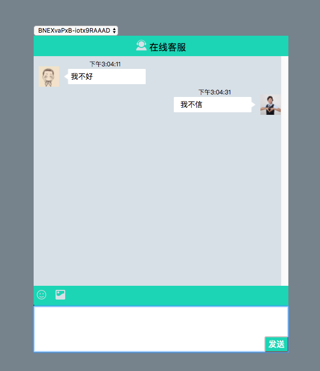客服端收到信息,聊天框左上方select多出一个选项,选择那串很长的东西(其实是socketId),发现刚刚接受到刚刚客户端发送来的信息,可以直接回复