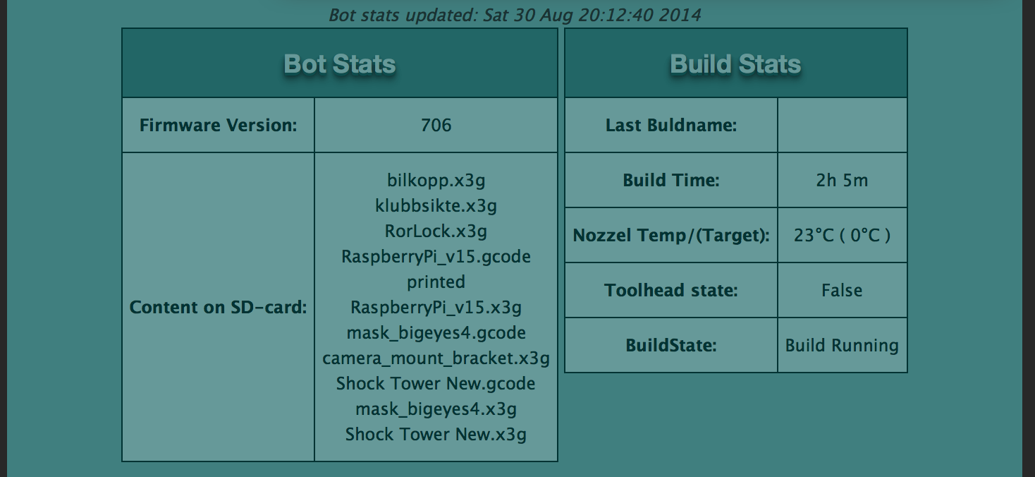 Finnished! now you should be able to browse to your RPi's IP adress via your favorite browser to access the MakerBot RPi Control Panel