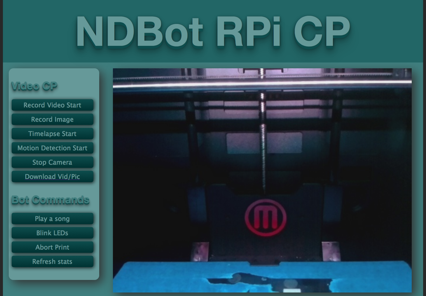 Web control panel and surveillance of your makerbot 3D-printer. With this installed on your Raspberry Pi with a PiCam attached you will be able to: