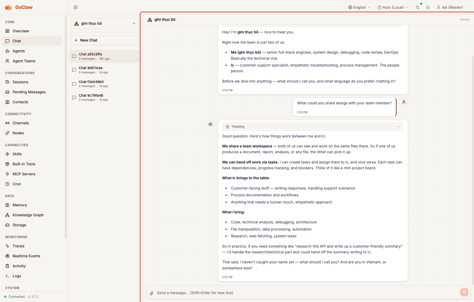 All captures: same instance (claw backend), same user (kai/Master), same agent (glm thục bô), same conversation. Callout borders mark the review area.