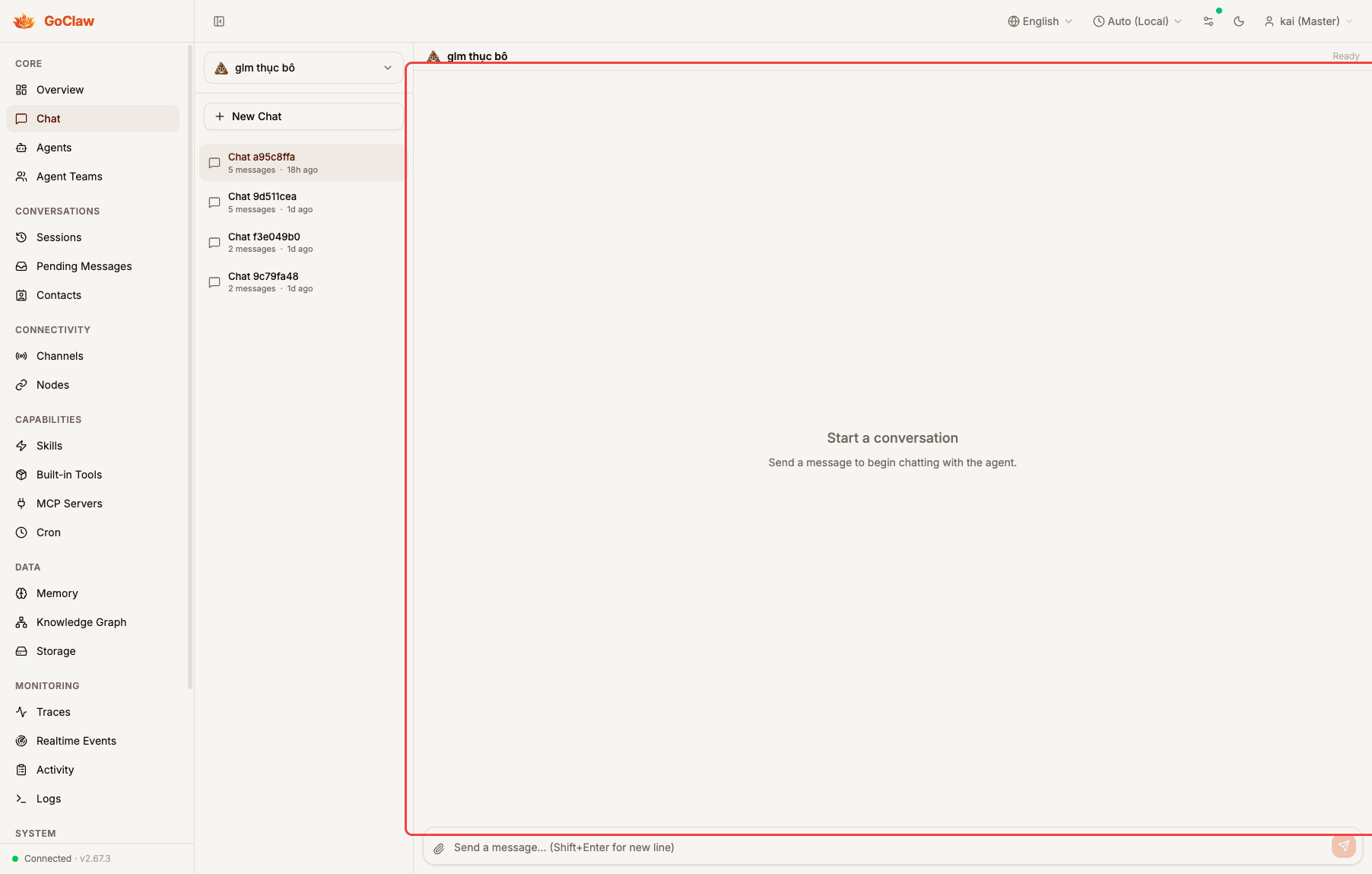 Before: Clicking "Chat a95c8ffa" from initial state — conversation highlighted but main area shows empty "Start a conversation" placeholder.