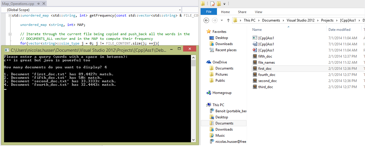 For example, to process two documents d1 and d2, where d1 contains the words "Java is great" and d2 contains "Awesome C++ is awesome" I built two vectors (one for d1, one for d2), each with a length of 5 (since we have five different words overall: ["awesome", "c++", "great", "is", "java"]. Each document vector di records how often each word appeared in the document di (if a particular word doesn't appear, the frequency is 0). In the example, d1 = (0; 0; 1; 1; 1) and d2 = (2; 1; 0; 1; 0). After reading in M documents, there are M of these vectors: d1;...;dM, each with a length N, where N is the total number of different words across all documents: di = (w1;w2;...;wN).