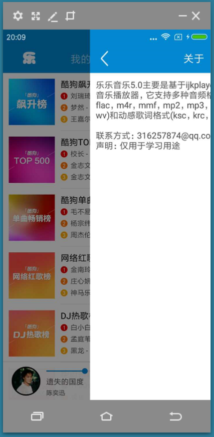 - 2018-01-14:修复RotateLinearLayout旋转角度在0.x时LrcActivity页面layout_lrc_playbar布局会闪烁。注:只在模拟器上面测试通过,真机没试过。