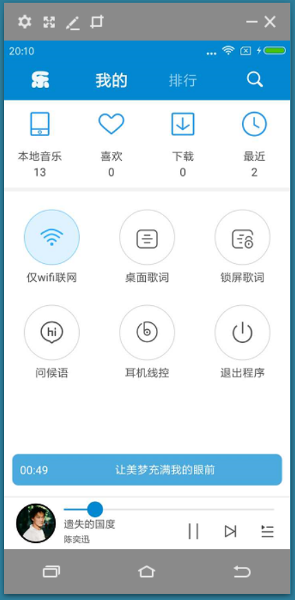 - 2018-01-21:添加悬浮窗口的权限判断和直接跳转设置界面(桌面歌词功能暂时没实现);锁屏歌词界面,因为部分小米手机(如:我的小米2s,android 5.0),需要到权限设置界面设置“锁屏显示”权限(注:歌曲播放时,才会显示锁屏界面)。