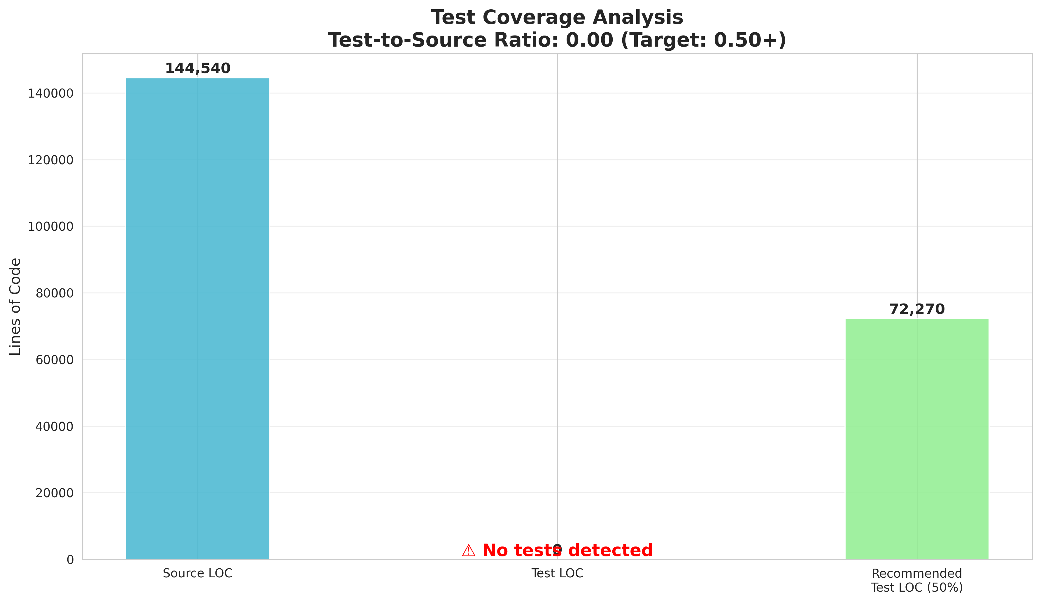 No test files detected in the repository. With 144,540 LOC of source material, a target of 72,270+ test LOC would be needed to reach a 0.5 test-to-source ratio. Adding any tests would immediately improve the quality score.
