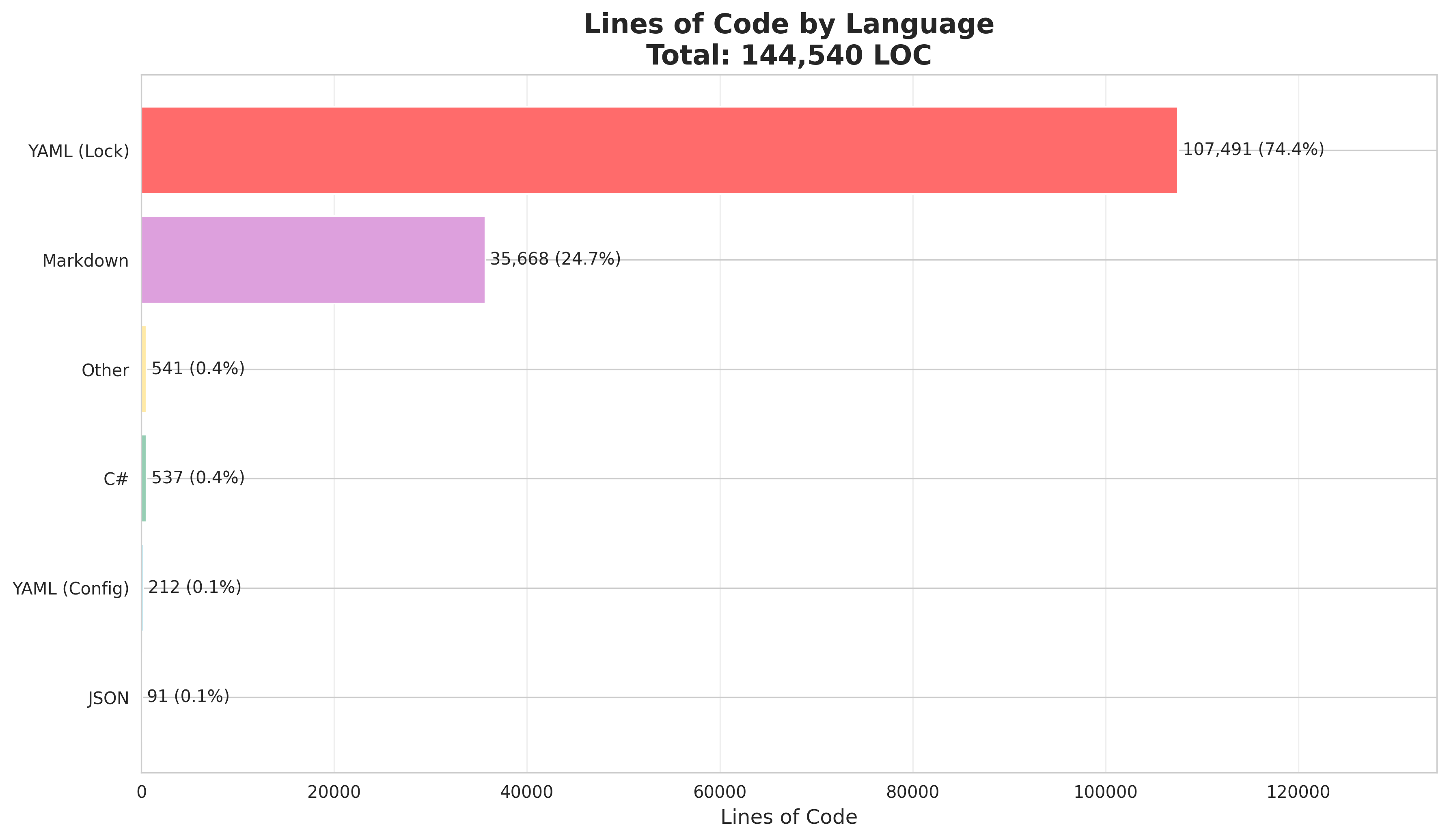 YAML lock files dominate at 107,491 LOC (74.4%), followed by Markdown at 35,668 LOC (24.7%). This is expected for an agentics workflow repository where compiled lock files represent workflow infrastructure.