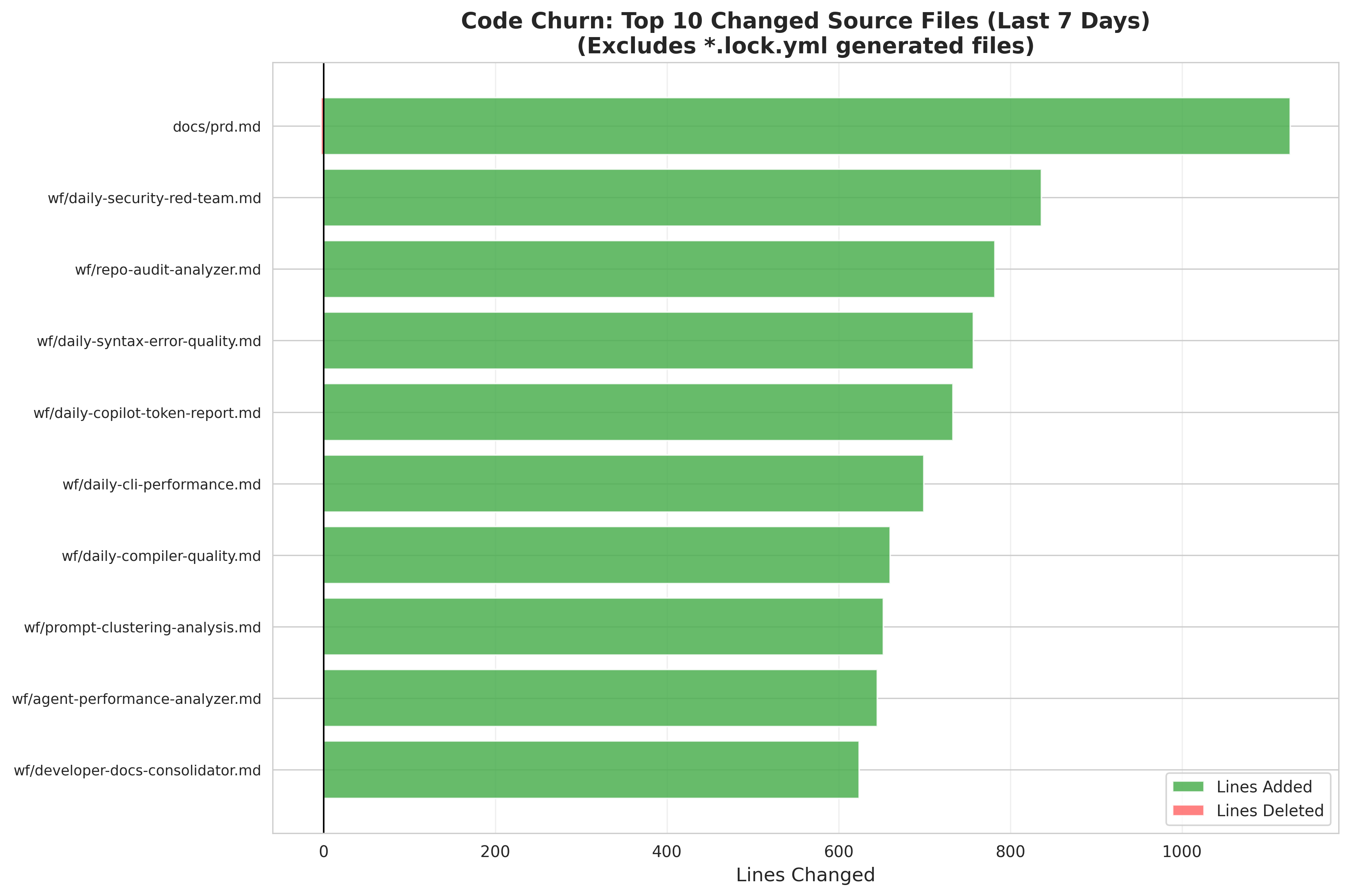 docs/prd.md: +1,126/-3 lines.github/workflows/daily-security-red-team.md: +836/0 lines.github/workflows/repo-audit-analyzer.md: +782/0 lines.github/workflows/daily-syntax-error-quality.md: +757/0 lines.github/workflows/daily-copilot-token-report.md: +733/0 lines.github/workflows/daily-cli-performance.md: +699/0 lines.github/workflows/daily-compiler-quality.md: +660/0 lines.github/workflows/prompt-clustering-analysis.md: +652/0 lines.github/workflows/agent-performance-analyzer.md: +645/0 lines.github/workflows/developer-docs-consolidator.md: +624/0 linesWorkflow Lock File Churn (*.lock.yml only)