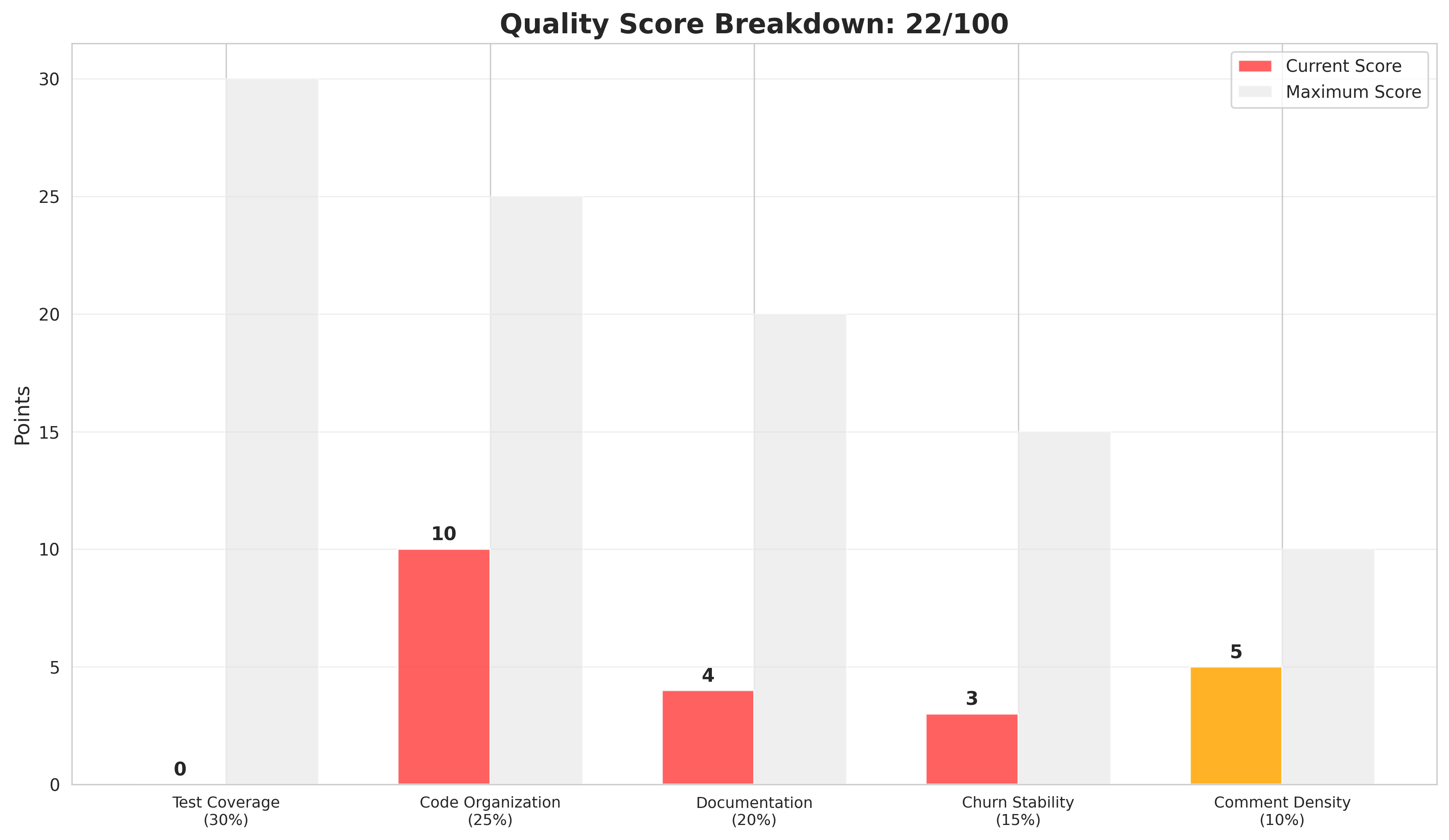The quality score of 22/100 is driven down primarily by zero test coverage (0/30) and low documentation coverage (4/20). Code organization (10/25) is impacted by 105 files exceeding 500 LOC — mostly generated lock files.