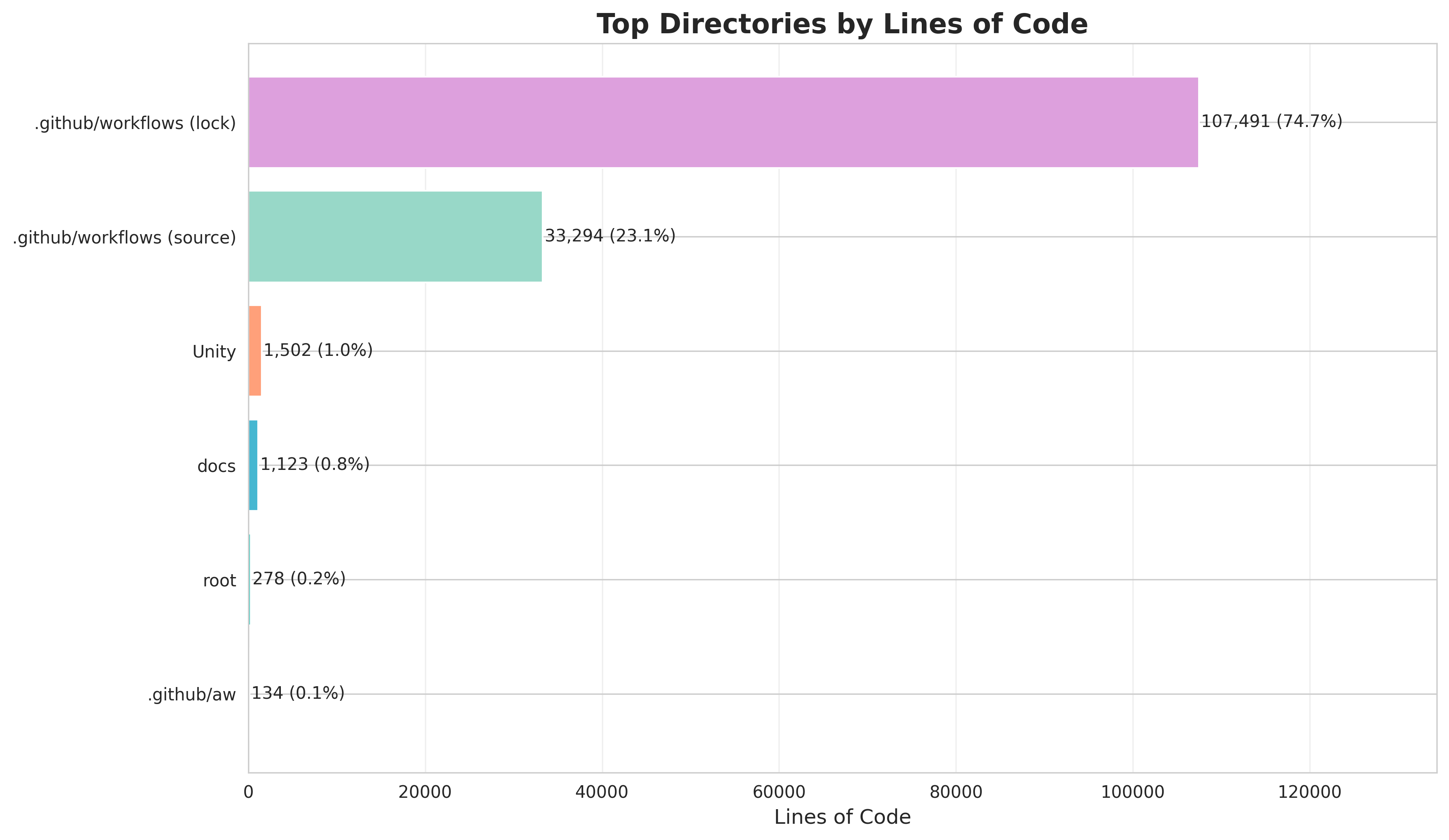 docs/prd.mdis the only documentation file for a 144K LOC codebase. Adding documentation for the Unity project, key workflows, and onboarding guides would improve the 4/20 documentation score.🟡 Reduce Lock File Noise: With 85 lock.yml files comprising 74% of codebase LOC, consider reviewing the lock file retention policy. Compiled workflow files inflate metrics and reduce code organization scores.